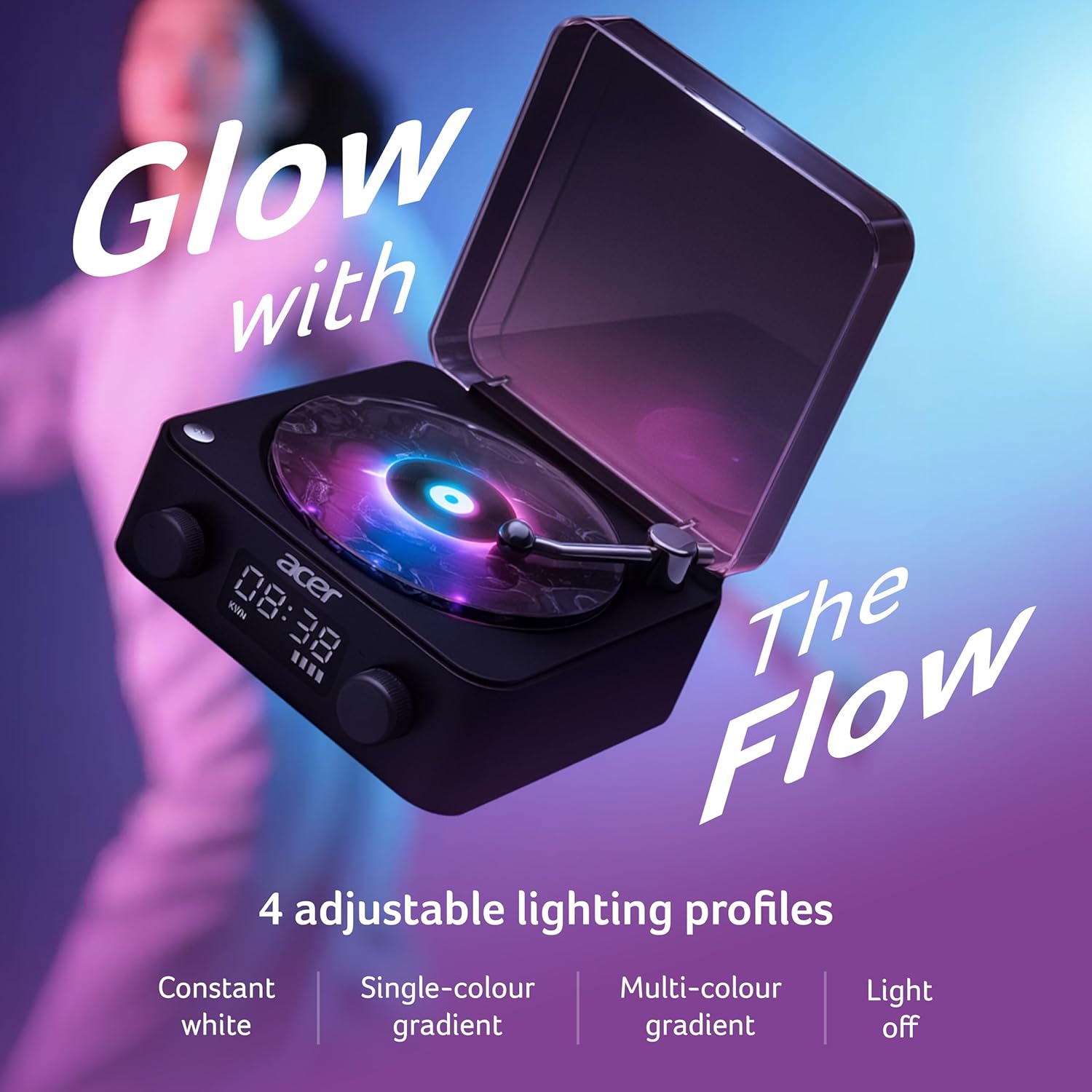 The Acer DreamWave Bluetooth 5W Speaker is a compact bedside device that combines a wireless speaker, RGB ambient lamp, and relaxing white noise machine. With Bluetooth connectivity, TF card and AUX support, and a built-in 1500mAh battery, it delivers portable music and soothing lighting for bedrooms, desks, and relaxation spaces.